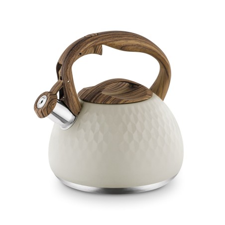 Stylowy czajnik Mauro 3 L ze stali nierdzewnej, w kolorze ecru, łączy elegancję z funkcjonalnością. Wyposażony w bezpieczny uchwyt z wbudowanym mechanizmem otwierania gwizdka, jest idealny dla każdego rodzaju kuchenki, w tym na indukcję.