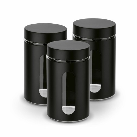 Komplet 3 pojemników Prato Tadar o pojemności 1 L. Pojemniki zostały wykonane z trwałego szkła sodowo-wapniowego w metalowej obudowie malowanej proszkowo. Idealne do przechowywania produktów sypkich jak kawa, herbata, mąka czy makaron.
