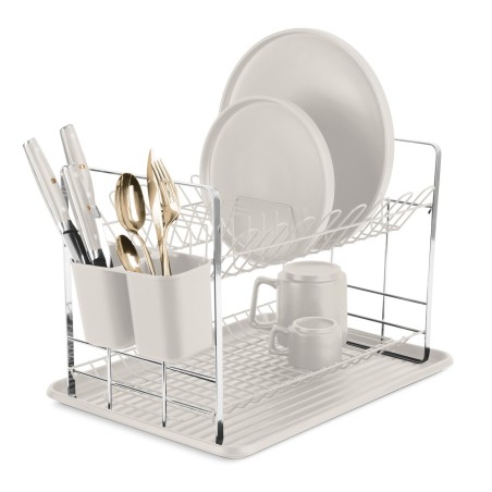 Dwupoziomowa suszarka posiada tackę gromadzącą ociekającą wodę oraz pojemniki na sztućce.